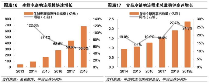 生鲜电商物流规模快速增长,冷链需求总量随之提升。生鲜电商对冷链运输需求节节攀升,同时也推动了整个食品冷链产业的发展。根据易观智库数据,生鲜电商物流行业近年来保持50%以上的年增长率,2013年生鲜电商物流规模尚不足40亿元,2018年行业规模已达674亿元。据中国物流与采购联合会信息,2019年我国食品冷链物流需求总量预计达到2.35亿吨,同比增长24.3%。