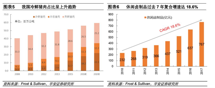 2)更健康和更美味推动休闲卤制品成为零食新宠:与其他零食品类相比,休闲卤制品散装保质期多数为3天,MAP包装可延长至5-7天。休闲卤制品运输、售卖均在低温环境中,较短的保质期使得产品口感更好且更营养,完美契合新时代消费者渴望新鲜、健康的休闲零食的需求;且辣味和嚼劲带来更强快感,上瘾性提升消费粘性。休闲卤制品受益零食健康化、高端化升级的趋势,长期实现双位数稳健成长。
