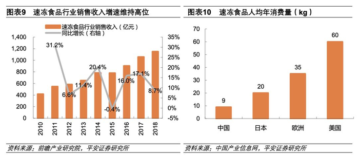速冻食品稳健增长,食品冷链物流需求加速释放。速冻食品指通过急速低温(-18℃以下)加工出来的食品,具有保持原有品质、不易腐败的特点。速冻食品在运输和仓储过程中需持续保持低温,只能通过冷链体系进行运输,一直是食品冷链的主力产品。随着生活水平提高和节奏加快,速冻食品因其便利性广受欢迎,近年来行业销售收入处于稳健增长阶段。2018年我国速冻食品行业销售收入达1,149亿元,是2010年的近3倍。