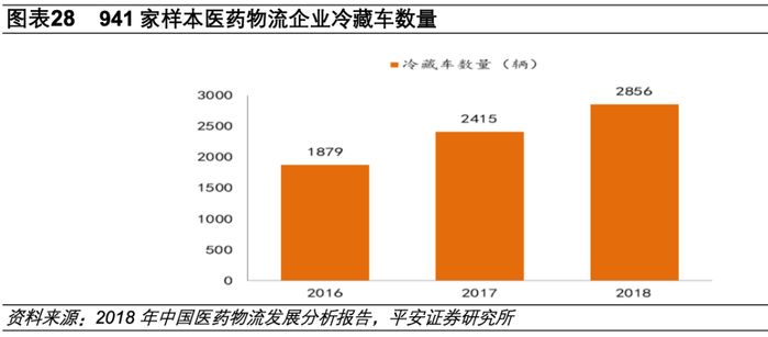 随着疫苗“一票制”以及监管趋严,这两年我国医药冷链运输规范性得到极大提高,规模也相应增大。以我国医药商业协会的数据为例,其941家样本医药物流企业的冷藏车数量从2016年的1879家增长到2019年的2856家。预计未来医药冷链运输范围将进一步扩大。