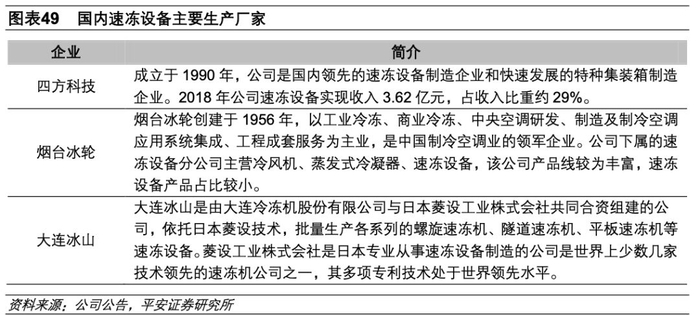 目前我国速冻设备市场主要分为三个梯队。第一梯队为国外品牌,包括瑞典Frigoscandia、加拿大Aero Freezer、以及冰岛Marel。这类产品定位高端,品种单一,在国内销量较少。第二梯队为国内领先企业,包括四方科技、烟台冰轮和大连冰山。该梯队产品专注于中高端领域,具有竞争优势。第三梯队为国内众多中小企业,产品低端,竞争力较弱。