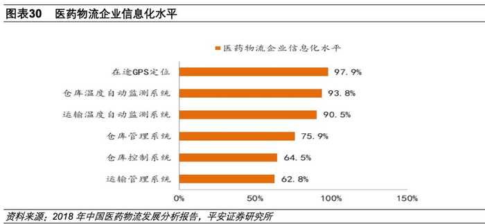 此外,医药冷链对信息化要求更高。根据中国医药商业协会医药物流数据库中的941家医药企业的物流资源数据,我国医药冷链企业中,90%以上的企业配备了运输温度自动监测系统、仓库温度自动监测系统、在途GPS定位,60%以上的企业配备了运输管理系统、仓库控制系统和仓库管理系统。