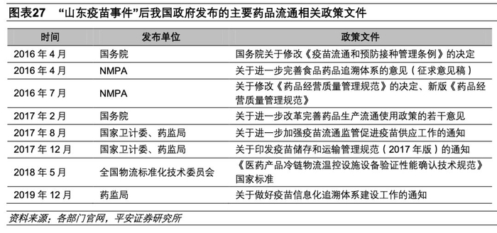 除行业自身需求推动以外,我国医药冷链物流近年来政策趋严,驱动行业进一步发展。我国对于医药冷链物流一直有明确的政策规定,不过早年在执行过程中并未严格遵守。众多中小型配送商完全不具备冷链运输条件,仅仅依靠冰袋冰箱降温,成为药品安全的极大隐患。直到2016年“山东疫苗事件”曝光,引起各单位对疫苗以及医药冷链运输的重视。国家陆续出台了多个规范药品流通环节的文件;各流通公司也积极响应,例如国药物流专门成立了冷链事业部。
