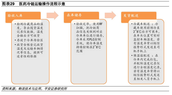 医药冷链相对于食品饮料冷链,技术要求更高,尤其是对全程温度控制更加严格。为了保证药品整个流通过程始终处于特定温度区间内,医药冷链运输具有严格的操作流程。验收入库的时候需要检测温度,查看记录仪数据,合格后才验收;发货配送中实时监控温度,若有异常,需立刻通知司机。