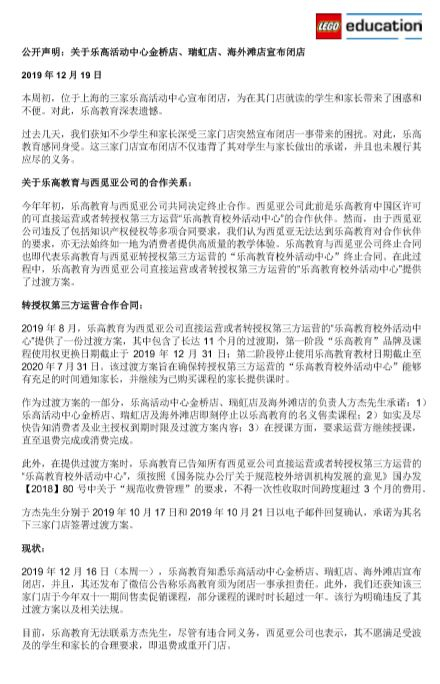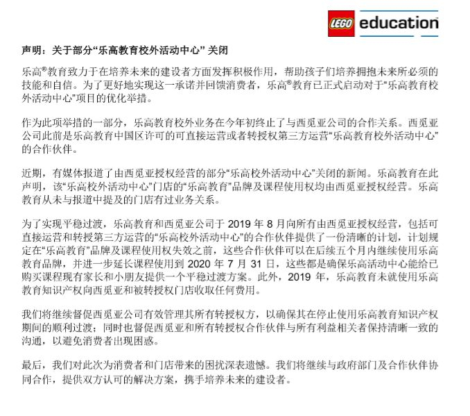 乐高教育方面还指出,为了实现平稳过渡,乐高教育和西觅亚公司于2019年8月向所有由西觅亚授权经营,包括可直接运营和转授第三方运营的“乐高校外活动中心”的合作伙伴提供了一份清晰的计划,计划规定在“乐高教育”品牌及课程使用权失效之前,这些合作伙伴可以在后续五个月内继续使用乐高教育品牌,并进一步延长课程使用到2020年7月31日。这些都是确保乐高活动中心能给已购买课程现有家长和小朋友提供一个平稳过渡方案。