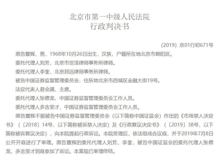 12月19日,获取的一份行政判决书显示,覃辉因不服中国证监会做出的《市场禁入决定书》及《行政复议决定书》,向北京市第一中级人民法院提起诉讼。
