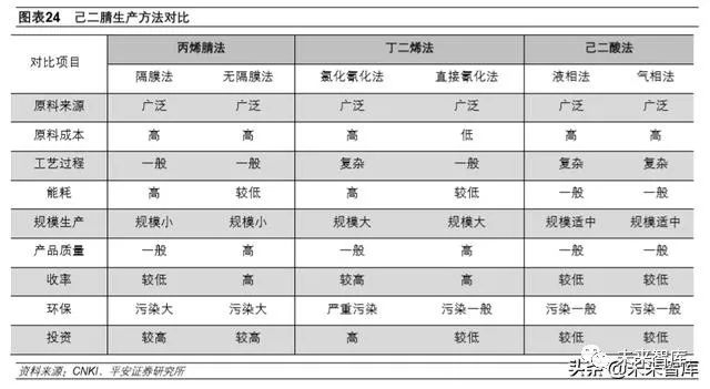 综上,从三种己二腈生产路线可以看出,最为落后的己二酸催化氨化法虽然我国曾经引进,但是由 于原料成本高昂没有竞争优势可言导致停产,已被淘汰。丙烯腈电解二聚法虽然生产门槛相对较低, 但受限于丙烯腈原料波动、电解用电的能耗和后期环保投入,也无竞争优势可言。而丁二烯直接氯 化法生产成本比己二酸催化氨化法低 40%,比丙烯腈二聚法低 20%,成为目前三种技术里面最先进 的技术。
