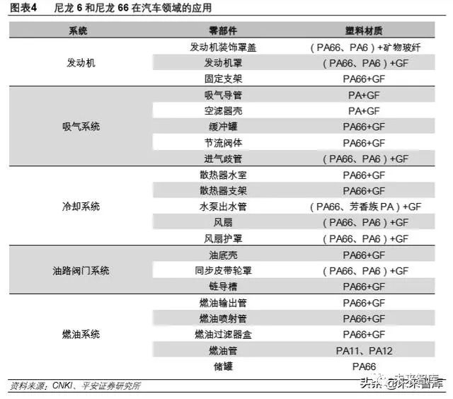 使用量最大的尼龙是尼龙 6 和尼龙 66,尽管两者的性能和应用领域有较大的重合,但是相对来讲尼 龙 66 的强度较大、耐磨性好、手感细腻、综合性能较好,但脆性大、不易上色且价格高于尼龙 6。 而尼龙 6 强度小、较为柔软,耐磨性比尼龙 66 差些,遇到冬季气温低的时候容易变脆,价格往往低 于尼龙 66,性价比较高。因此尼龙 6 在民用纺织领域优势更为突出,尼龙 66 在工业丝和工程塑料 领域优势更为突出,尤其是在尼龙 66 的传统下游汽车领域,尼龙 66 的可应用场景远远多于尼龙 6。