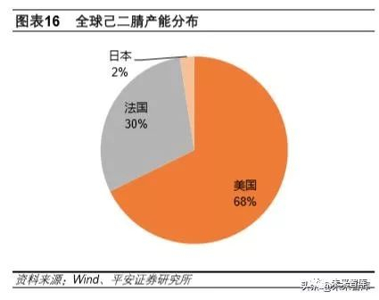 己二腈的生产工艺较长,催化剂体系复杂,反应物中还含有剧毒的氰化物,技术壁垒非常高。目前 全球的己二腈产能集中在美国、法国和日本,美国英威达是全球最大的己二腈生产商。由于国外对 己二腈技术垄断和封锁,中国目前尚未有一家企业能够规模化生产己二腈。