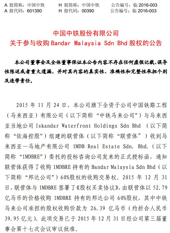 12月17日,中马合作建设的马来西亚大马城(Bandor Malaysia)项目签约仪式在马来西亚行政首都普特拉贾亚举行。与此同时,中国中铁发布《关于恢复参与收购 Bandar Malaysia Sdn Bhd 股权的进展公告》,公告显示股权购买价款合计 64.5 亿马来西亚林吉特。在该股权收购中,中铁马来公司需出资 32.25 亿马来西亚林吉特,约合人民币 54.48 亿元。