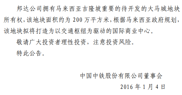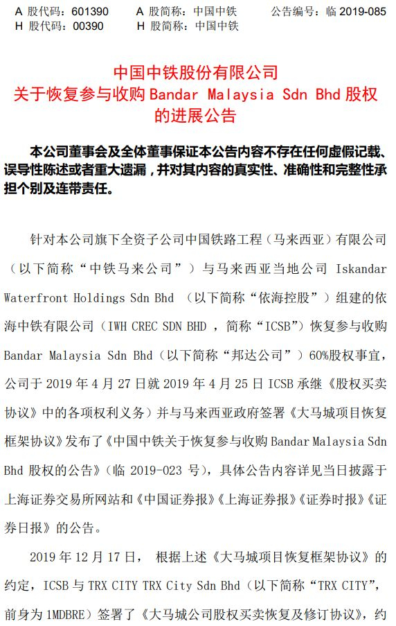 与此同时,中国中铁也发布了《关于恢复参与收购 Bandar Malaysia Sdn Bhd 股权的公告》。