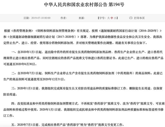 194号公告还提出,2020年1月1日前,农业农村部将完成抗球虫和中药类药物饲料添加剂品种质量标准和标签说明书修订工作。