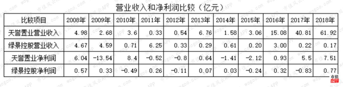 净利润也是如此,2008-2018年天誉置业的净利润累计达10.63亿元,绿景控股的净利润只有0.67亿元。