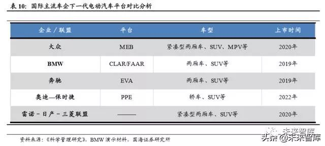大众:推出全新电动汽车 MEB 平台。电动化是大众汽车集团未来最核心的战略 基石之一。MEB 平台项目将为满足未来中国和欧洲的油耗法规要求,在同一平 台上至少投放10款车型,2020~2018年目标销量640万辆,产能划分是中国65%, 波兰 35%。MEB 平台已经落户一汽-大众佛山工厂。基于 MEB 平台可以衍生 出纯电动紧凑型两厢车、SUV 和 MPV 等车型。其中首款纯电汽车 I.D.在 2019 年 11 月量产,预计 2020 年进行销售。