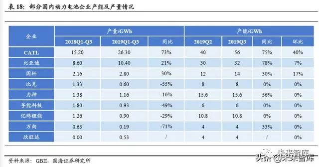 国内动力电池产能及产量:根据 GBII 数据显示,截止 2019 年 9 月,CATL、比 亚迪、力神、国轩的产能居前,年化产能分别为 56、32、15.6、14GWh,其中 CATL 与比亚迪的产能持续释放。同期亿纬锂能与欣旺达的产能分别为 10.8 与 4GWh,两者仍然在扩产。就产量而言,前三季度 CATL 与比亚迪出货量分别为 26.3 与 10.4GWh,录得行业前二。综合而言,CATL 目前处于一家独大的强势地 位,是目前动力电池领域中格局最优企业,而比亚迪的动力电池是否能强势依旧, 要视其海外客户开拓进展,亿纬锂能以及欣旺达势头客户拓展迅猛,有望成为黑 马。
