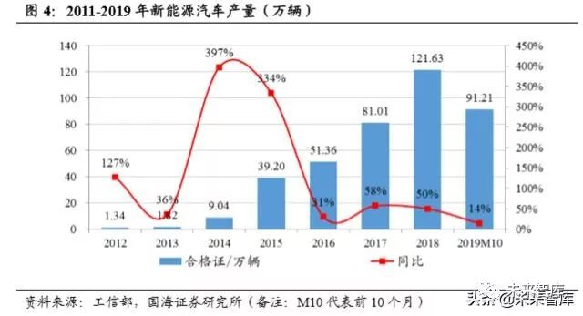顶层设计护航新能源汽车产业,2025年占比达到25%左右。2019年12月3日, 工信部正式发布《新能源汽车产业发展规划(2021-2035 年)》征求意见稿显示, 到 2025 年新能源汽车市场竞争力明显提高,动力电池、驱动电机、车载操作系 统等关键技术取得重大突破。新能源汽车新车销量占比达到 25%左右,智能网 联汽车新车销量占比达到 30%,高度自动驾驶智能网联汽车实现限定区域和特 定场景商业化应用。2019 年 1-10 月新能源车销售 94.7 万辆,仅占同期国内汽 车总销量 2065.2 万辆的 4.6%,未来市场空间巨大。