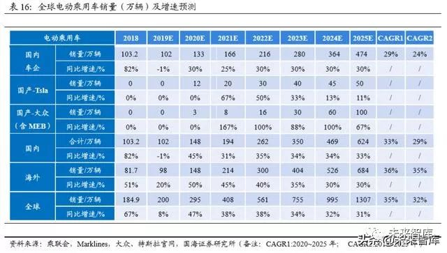 全球电动乘用车销量预测,7 年 6 倍增长空间:至 2025 年,我们预期全球电动 乘用车的销量为1307万辆,同比2018年184.9万辆有6倍增长空间,期间CAGR 为 32%。其中,至 2025 年外海与国内(含国产特斯拉及大众/MEB 平台)销量分 别为684与624万辆,2020至2025年5年期间的CAGR分别约为36%、33%。