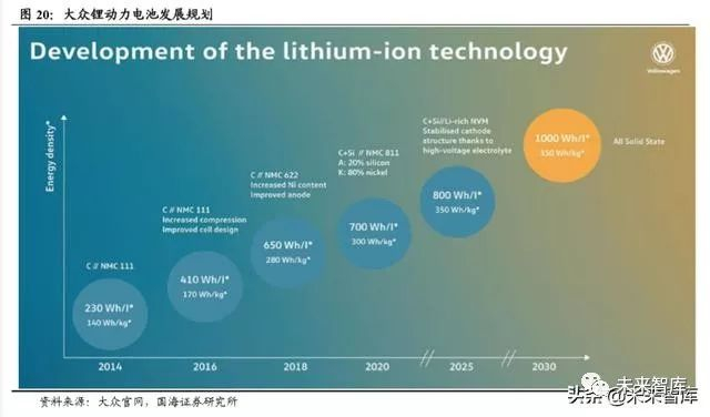 大众锂动力电池的应用规划:从材料体系来看,正极材料从 NMC111→NMC622 →NMC811→富锂材料,高镍趋势明显;负极从石墨→石墨/硅(20%);高电压 电解液体系等多方面发展。大众锂电池的应用体系的能量密度从 140→170→280 →300→350Wh/kg 逐级提升,最终在锂电池体系中将会采用全固态电池体系,基 本上与各大动力电池企业的规划相一致。但需要说明的是,兼顾安全性、成本、 性能及验证周期等多因素,电池技术的更新升级是相对缓慢的一个过程,使得动 力电池龙头企业在二级市场会存在溢价效应。