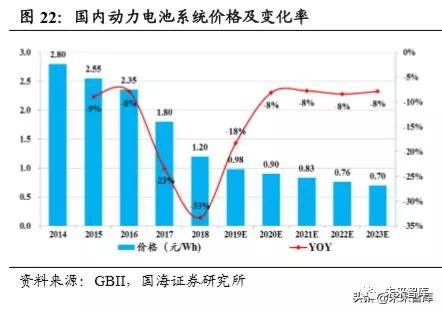 动力电池:价格呈现快速下行趋势,加速电动车平价时代到来。根据 GBII 与 Bloomberg 数据,2014~2108 年国内与海外动力电池价格 CAGR 分别为-19.1%与 -25.7%;同期国内价格略低于海外,随着外资电池巨头相继在国内投产,基于原 材料的逐步国产化,两者价格有望趋同。同时,我们预测国内动力电池价格在 2023 年将降至 0.7 元/Wh,对应 2019~2023 年 5 年间降幅约为-10%,将加速电动 车 C 端需求的平价时代。