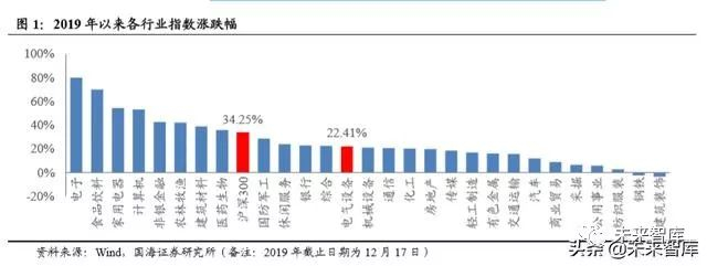 截止 12 月 17 日,2019 年电气设备行业指数涨幅为 22.41%,在全市场 29 个行 业中处于居中的位置,但大幅跑输沪深 300 指数 34.25%的涨幅。