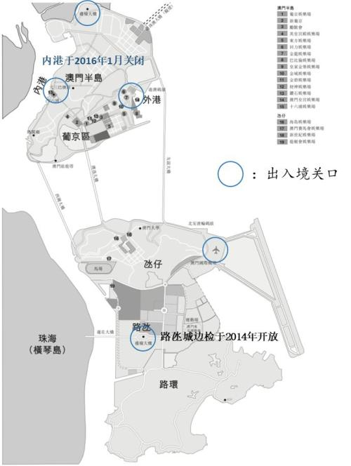 由于位于路氹的各类入澳门关口不断修建,从路氹入境的游客人次逐年增加,通过路氹进入澳门旅客人次从2008年时的14%增加至2018年的29%。