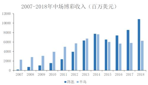 2018年路氹当地区中场博彩收入为108.49亿美元,而半岛仅为62.84亿美元。