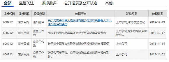 矗立在风口浪尖的南宁百货(600712.SH),近日频繁登上热搜。继2019年12月17日南宁百货、控股股东及实控人收到监管工作函(就公司股票交易异常波动相关事项明确监管要求)之后,12月19日南宁百货再被通报批评,涉及对象上市公司、财务总监、董秘。