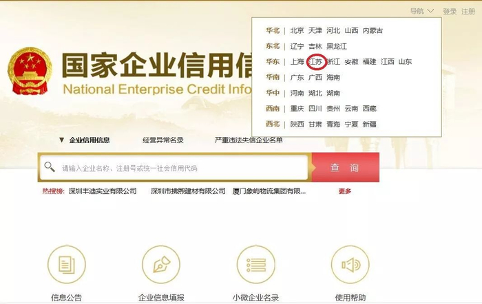将鼠标移至页面右上角“导航”处,根据企业登记机关所在地选择相应地区。