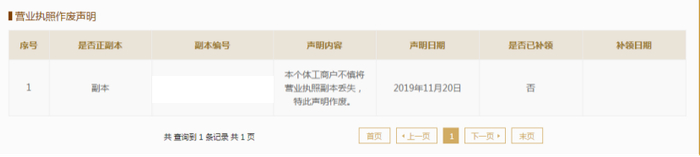 下拉页面至显示“营业执照作废声明”一栏后右键打印,携带打印件、身份证复印件一份,经营者本人来窗口办理相关手续