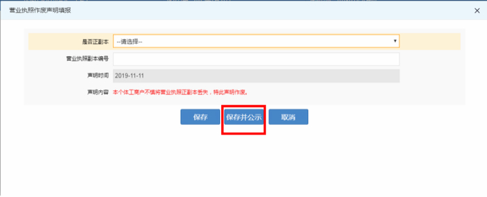 其中,“是否正副本”为选择丢失的执照类型,可选正本、副本或正副本3种,全部填写完成后点击“保存并公示”