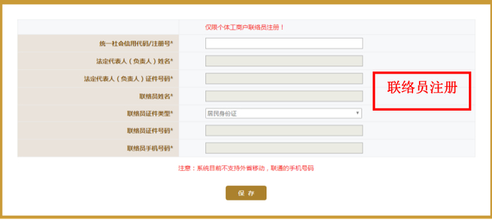 【注意】若经营者是首次登录此系统,或输入“统一社会信用代码/注册号”后出现如下方“信息有误!未办理联络员,请核对后重新输入。”字样,则需在登录前先进行联络员注册。
