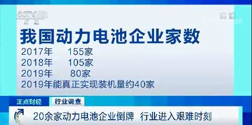 数据显示,2017年,我国动力电池企业共有155家;2018年,这一数字下滑到了105家;到了今年,就只剩下80家动力电池生产企业,其中能真正实现装机量的仅40家左右。