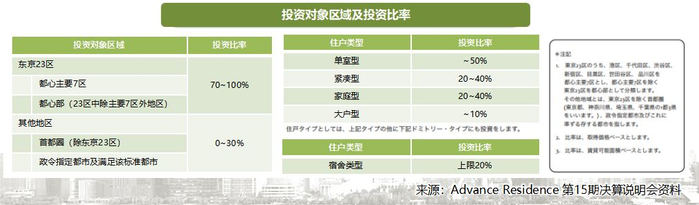 我们看说这个也是日本的一家REITs它的住宅组合当中的一个特征,也是他向投资人做一个说明的时候,他是说他的收购的物业将近90%都是集中在东京23区的,同时像这种单身用的小的公寓占比也在80%以上,这个也是再突出自己的优势上面的特别特意重点强调的一些内容。