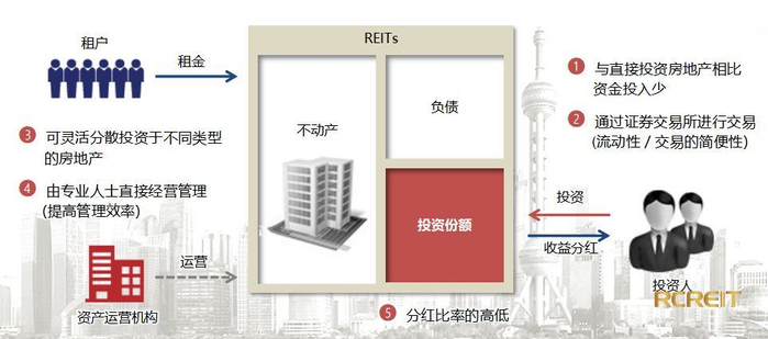 因为投资人他如果要直接去投资一个房地产的话,一个是资金投入比较大,另外可能涉及到一些比较复杂的问题,那么通过REITs这个架构,通过在证券交易所进行交易的方式,可以为投资人提供一种比较简洁的房地产投资的方式。