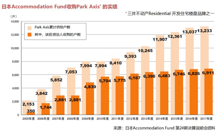 这张图是三井不动产下面的一个REITs,主要是这家REITs收购的物业的栋数和它下面的一个品牌,叫Park Axis,它品牌供给的一个户数的走势。