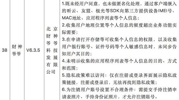 此外,财神爷爷存在既未经用户同意,也未做匿名化处理,通过客户端嵌入的听云、友盟、极光等SDK向第三方提供设备IMEI号、MAC地址、应用程序列表等个人信息;收集用户地理位置等个人信息的频度超出业务功能实际需要等六项违规收集个人信息问题。