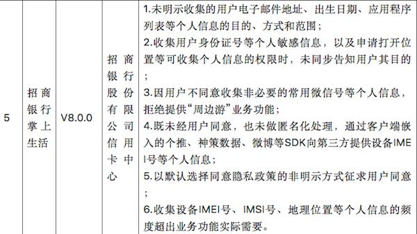 具体而言,招商银行掌上生活存在未明示收集的用户电子邮件地址、出生日期、应用程序列表等个人信息的目的、方式和范围;收集用户身份证号等个人敏感信息,以及申请打开位置等可收集个人信息的权限时,未同步告知用户其目的;因用户不同意收集非必要的常用微信号等个人信息,拒绝提供“周边游”业务功能等六项违规收集个人信息问题。