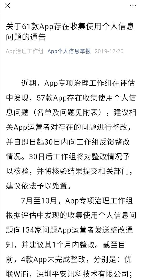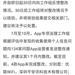 通告强调,7月至10月,App专项治理工作组根据评估中发现的收集使用个人信息问题向134家问题App运营者发送整改通知,并建议其1个月内整改。截至目前,深圳平安付科技术有限公司等4款App未完成整改。