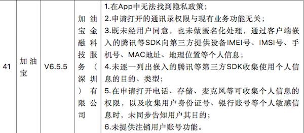 根据通报,加油宝也被点名,主要存在六项违规收集个人信息问题,具体为在App中无法找到隐私政策;申请打开的通讯录权限与现有业务功能无关;既未经用户同意,也未做匿名化处理,通过客户端嵌入的腾讯等SDK向第三方提供设备IMEI号、IMSI号、手机号、MAC地址、地理位置等个人信息等。