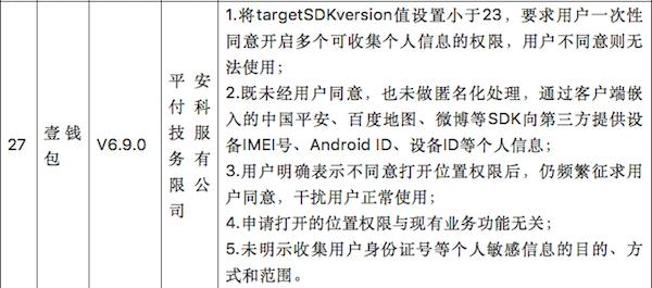 通告显示,壹钱包存在将既未经用户同意,也未做匿名化处理,通过客户端嵌入的中国平安、百度地图、微博等SDK向第三方提供设备IMEI号、Android ID、设备ID等个人信息等五项违规收集个人信息问题。