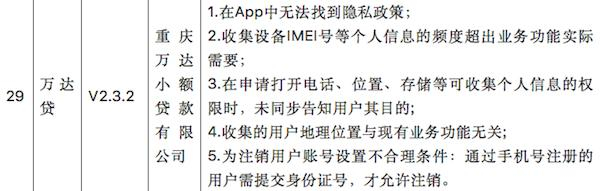 与此同时,重庆万达小额贷款有限公司旗下运营APP万达贷因在APP中无法找到隐私政策;收集设备IMEI号等个人信息的频度超出业务功能实际需要;在申请打开电话、位置、存储等可收集个人信息的权限时,未同步告知用户其目的等五项违规收集个人信息问题。