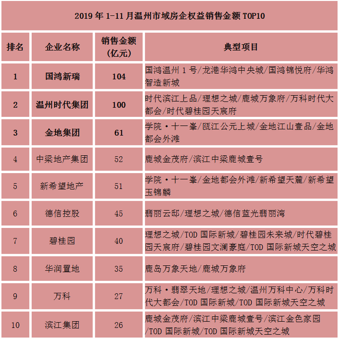 2019年温州楼市本土房企国鸿新瑞领跑,温州时代集团、中梁地产分别位居第二、第四;外来房企竞争激烈,金地集团、新希望地产、德信控股等外来品牌企业销售表现突出,进入TOP10榜单。