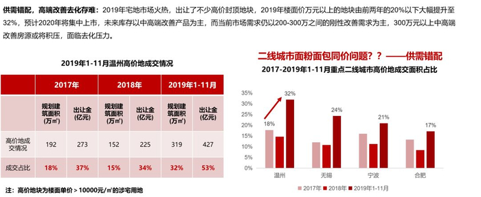 19年市场整体向好:1-11月供应量与去年同期基本持平,预计年末冲刺销售额,入市项目将增多。另上半年土地市场回暖,地价逐渐回升,新房预期上升,出现多个“售罄盘”,去库存明显。