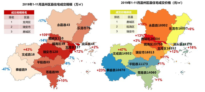 各区县成交较去年增长明显,鹿城区成交量居首,成交规模前五分别是:鹿城区、瓯海区、瑞安市、苍南县、乐清市。成交价格方面,龙湾区位居榜首,成交价格前五分别是:龙湾区、鹿城区、瑞安市、瓯海区、乐清市。