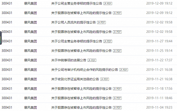 在12月9日的公告中,暴风集团宣布,因拖欠合作方机房服务器托管费用,合作方已终止提供服务,导致公司网站和手机客户端不能正常提供服务。公司的主要业务处于停顿状态,经营发展受到严重制约,面临无业务收入来源的风险。且公司的办公场地租金支付到2020年2月底,届时如果无法及时缴纳租金,将面临无办公场地的风险。公司员工持续大量流失,目前仅剩10余人(除冯鑫外,高管已全部辞职,证代也辞职),同时存在拖欠部分员工工资的情形。另外,暴风集团还因尚未聘请首席财务官和审计机构,存在无法在法定期限内披露2019年年度报告的风险。在司法风险上,暴风集团也不遑多让,公司收到北京仲裁委员会送达的《裁决书》,裁决公司向上海歌斐资产管理有限公司支付转让价款、违约金等合计4.7亿元,也因此,公司存在无法支付上述费用产生的法律风险。