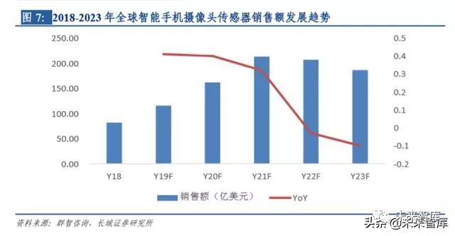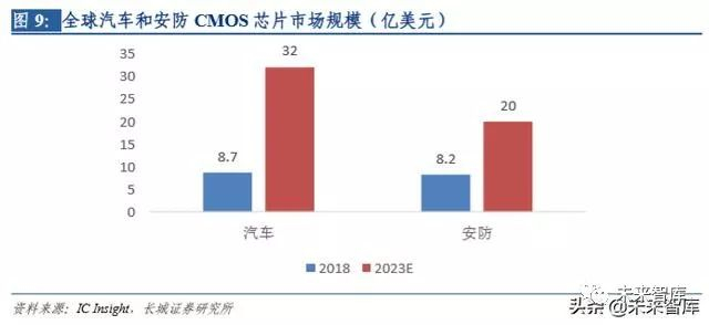 CMOS 芯片作为摄像头的核心部件,在汽车以及安防摄像头需求的带动下,有望取得高 增长。其中汽车 CMOS 芯片 2018 年市场规模为8.7 亿美元,预计 2023 年可达 32 亿美元, CAGR 约为 29.7%。安防 CMOS 芯片 2018 年市场规模为 8.2 亿美元,预计 2023 年可达 20 亿美元,CAGR 约为 19.5%。CMOS 芯片的高速发展侧面反映摄像头领域的景气度整 体上行。