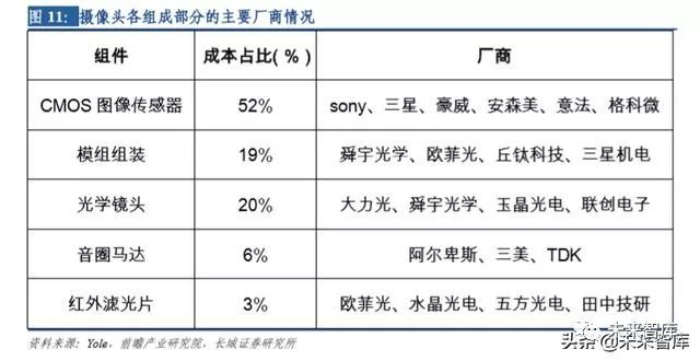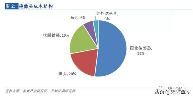 从摄像头的成本占比来看,图像传感器是成本占比最高的部分,占总成本超过一半,镜 头是成本占比第二高的部分,占比约 20%。另外,模组封装、马达、红外滤光片占比分 别为 19%、6%、3%。