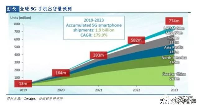 5G 手机为智能手机重回增长轨道提供动力,截止 10 月底,国内 5G 手机出货量总计达 328.1 万部,预计今年全球 5G 手机出货量可达 1300 万部,明年随着 5G 手机的大规模出 货,全球智能手机市场有望迎来复苏。根据 Canalys 的数据,2020 年 5G 手机出货量可达 1.64 亿部,2023 年可达 7.74 亿部,2019-2023 年的 CAGR 可达 179.9%。