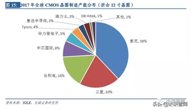 就 CMOS 芯片制造工艺而言,目前高像素 CMOS 芯片主流制程为 55nm(12 寸晶圆), 而低像素芯片制程较低,通常在 8 寸晶圆上进行代工制造。据 Yole 报告,2017 年全球 CIS芯片产能折合12寸晶圆为242.2万片,月产能约为20万片;其中,索尼产能占比38%, 全部为自用;三星产能占比 20%,包含自用与代工;台积电、中芯国际与华力微电子产 能合计占比 29%,全部为代工。前五家工厂产能合计占比达 87%,CMOS 芯片晶圆制造 技术与资金壁垒高,市场集中度高。