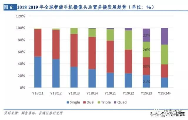在摄像头需求数量方面,由于三摄和四摄渗透率进一步提高,带动单机搭载的摄像头平 均数量持续提高。根据群智咨询的数据,2019 年 Q3 智能手机后摄出货占比中,双摄占 比 30%,三摄占比 26%,四摄占比 22%,四摄占比不论是与 Q2 相比还是去年同期相比,均有大幅提高。在多摄需求的带动下,Q3 手机摄像头传感器出货量达到了 13 亿颗,同 比增长 14%,远高于智能手机出货量的增速。